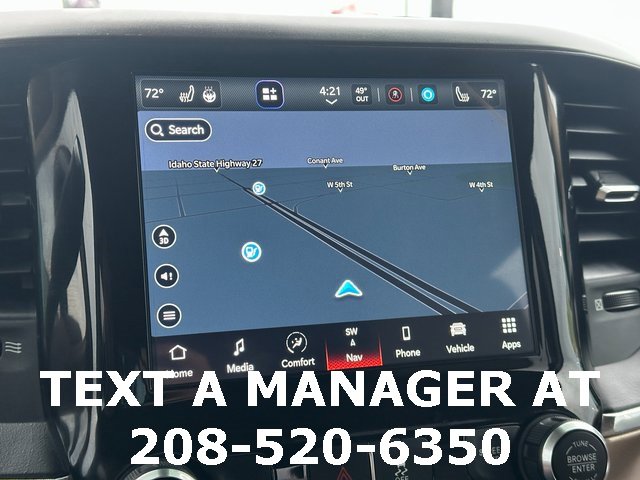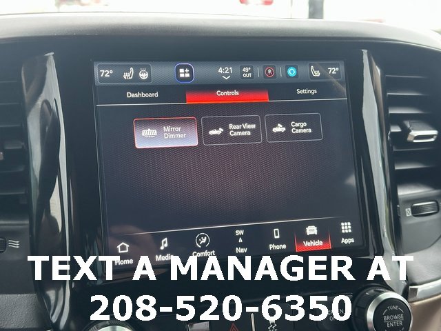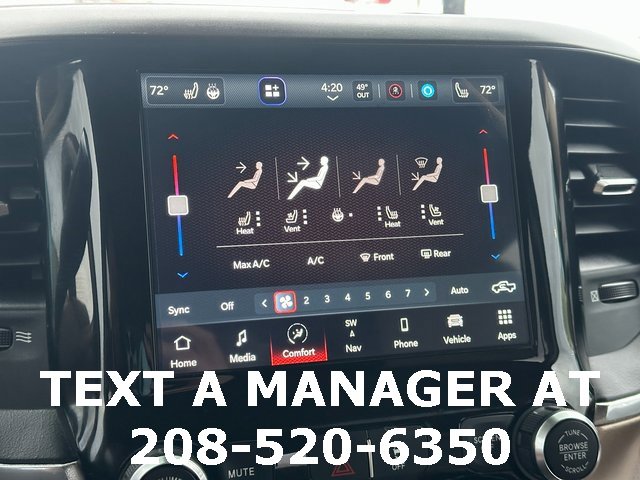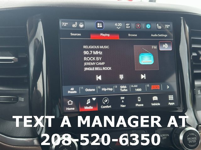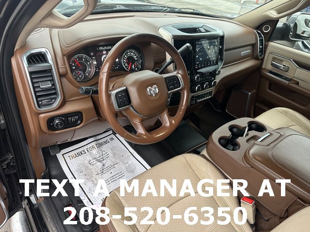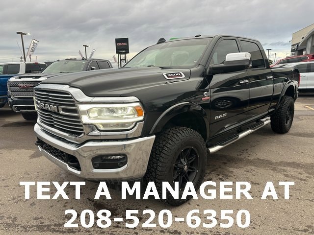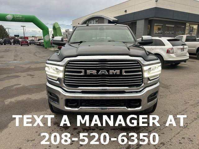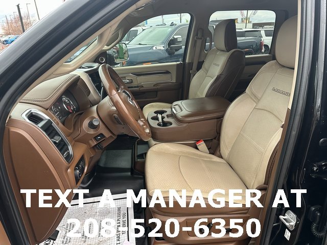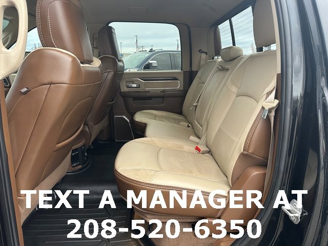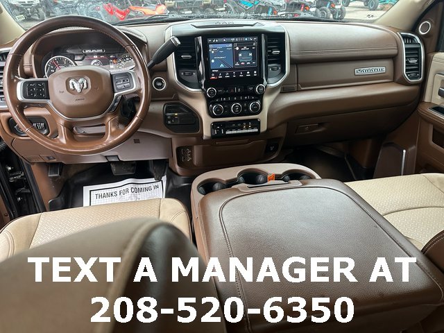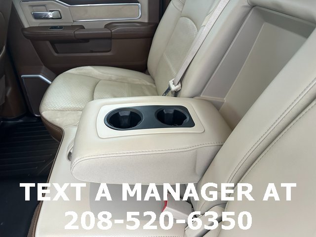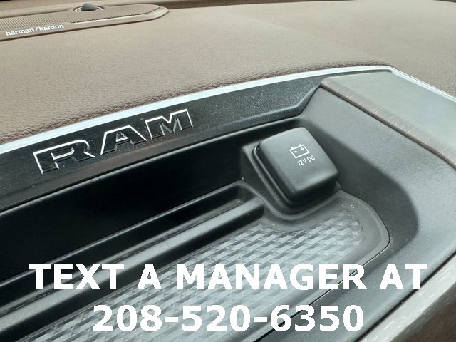 BLUETOOTH, BACK UP CAMERA, APPLE CARPLAY/ANDROID AUTO, #1 Seat Foam Cushion, 10 Speakers, 115V Auxiliary Rear Power Outlet, 17 Speaker harman kardon Premium Sound, 2 Way Rear Headrest Seat, 220 Amp Alternator, 2nd Row In Floor Storage Bins, 3.73 Axle Ratio, 4 Way Front Headrests, 4-Wheel Disc Brakes, 4G LTE Wi-Fi Hot Spot, 8.4 Touchscreen Display, ABS brakes, Active Noise Control System, Adjustable pedals, Air Conditioning, Alexa Built-In, All R1 High Radios, All Radio Equipped Vehicles, Alloy wheels, AM/FM radio: SiriusXM, Apple CarPlay, Apple CarPlay/Android Auto, Auto High Beam Headlamp Control, Auto-dimming Rear-View mirror, Automatic temperature control, Bluetooth Handsfree Phone & Audio, Brake assist, Bumpers: chrome, Center Hub, Chrome Exterior Mirrors, Cold Weather Group, Compass, Connected Travel & Traffic Services, Connectivity - US/Canada, CTR Stop Lamp w/Cargo View Camera, Dash Pass Thru Wire Circuits, Delay-off headlights, Disassociated Touchscreen Display, Driver door bin, Driver vanity mirror, Dual front impact airbags, Dual front side impact airbags, Electronic Stability Control, Electronically Controlled Throttle, Engine Block Heater, Exterior Mirrors w/Memory, Foam Bottle Insert (Door Trim Panel), Folding Flat Load Floor Storage, For Details Visit DriveUconnect.com, For More Info, Call 800-643-2112, Front anti-roll bar, Front Bumper Sight Shields, Front Center Armrest w/Storage, Front dual zone A/C, Front fog lights, Front License Plate Bracket, Front reading lights, Front Seat Back Map Pockets, Fully automatic headlights, Garage door transmitter, Global Telematics Box Module (TBM), Google Android Auto, GPS Antenna Input, GPS Navigation, HD Radio, Heated door mirrors, Heated Front Seats, Heated front seats, Heated Second Row Seats, Heated Steering Wheel, Heated steering wheel, High Back Seats, I/P Mounted Auxiliary Switches, Illuminated entry, Integrated Center Stack Radio, Integrated Voice Command w/Bluetooth, Laramie Level B Equipment Group, Leather steering wheel, Leather Trim 40/20/40 Bench Seat, Low tire pressure warning, Manufacturer's Statement of Origin, Mirror-Mounted Aux Reverse Lamps, MOPAR Winter Front Grille Cover, Occupant sensing airbag, Off-Road Information Pages, Outside temperature display, Overhead airbag, Overhead console, Panic alarm, ParkView Rear Back-Up Camera, Passenger door bin, Passenger vanity mirror, Power 8-Way Adjustable Passenger Seat, Power Adjust 8-Way Driver Seat, Power Adjustable Convex Aux Mirrors, Power Adjustable Pedals w/Memory, Power Chrome Tow Mirrors w/Convex Spotter & Memory, Power door mirrors, Power driver seat, Power passenger seat, Power steering, Power windows, Quick Order Package 2HH Laramie, Radio data system, Radio: Uconnect 5 Nav w/8.4 Display, Radio: Uconnect 5 w/8.4 Display, Radio/Driver Seat/Mirrors/Pedals Memory, Rain Sensitive Windshield Wipers, Rear 60/40 Folding Seat, Rear reading lights, Rear seat center armrest, Rear step bumper, Rear window defroster, Remote keyless entry, Remote Tailgate Release, Security system, Selectable Tire Fill Alert, SiriusXM Radio Service, SiriusXM Satellite Radio, SiriusXM w/360L, Speed control, Split folding rear seat, Steering wheel mounted audio controls, Tachometer, Tilt steering wheel, Tip Start, Traction control, Trip computer, Turn signal indicator mirrors, Variably intermittent wipers, Vendor Painted Cargo Box, Vendor Painted Cargo Box Tracking, Ventilated Front Seats, Voltmeter, Wheels: 18 x 8.0 Polished Aluminum. Diamond Black Crystal Pearlcoat Cummins 6.7L I6 Turbodiesel 6-Speed Automatic 4WD